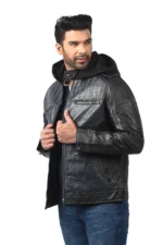 Men’s Black Leather Biker Jacket with Hood – Stylish Motorcycle Jacket
