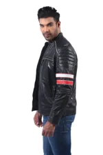 The Men’s Black Leather Cafe Racer Jacket with Red & White Stripes combines sleek design with rugged durability. Inspired by classic racing jackets, this piece is perfect for men who want a sporty edge while keeping it stylish and versatile.