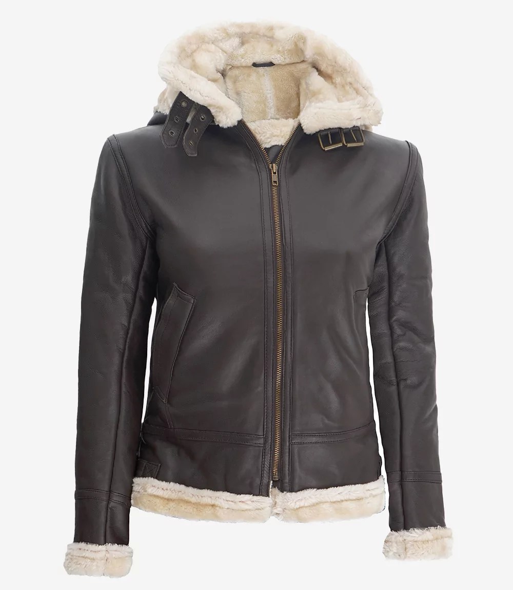 Women’s Brown Shearling Leather Jacket with Fur Hood
