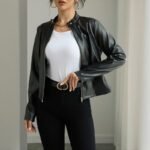 This innovative jacket combines classic tailoring with contemporary moto-inspired details, featuring a structured stand collar and unique single button closure that creates a minimalist aesthetic. The full front zipper adds an unexpected modern twist while providing adjustable coverage. Crafted from 95% polyester/5% spandex with premium faux leather finish, this blazer offers the look of leather with comfortable stretch and easy care. The tailored fit and long sleeves maintain professional polish while the edgy details make a fashion statement. Available in sizes S-XXL to suit various style preferences.
